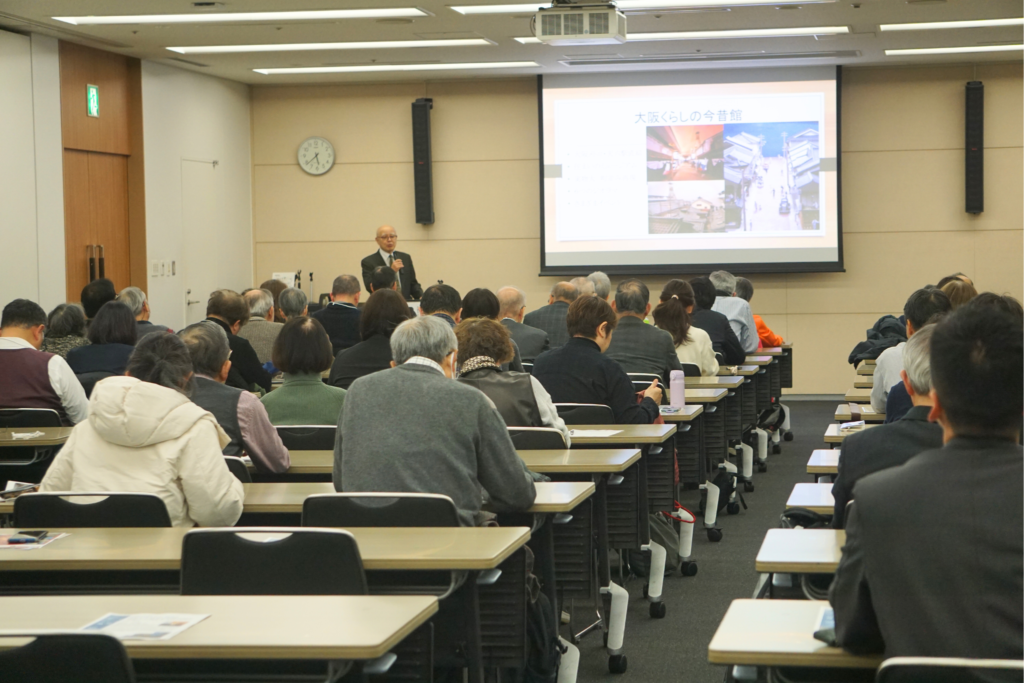 講演会では大阪市立住まいのミュージアム(大阪くらしの今昔館)館長の増井さんを講師としてお迎えして、【堺筋から見えた大阪の歴史】をテーマにご講演いただきました。