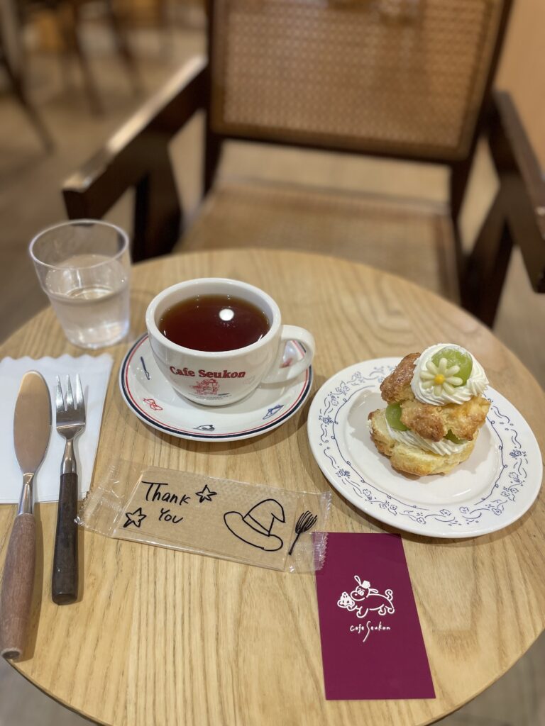 おすすめ!堺筋 土曜日のカフェタイム 2025.10.06 ランチ後のティタイム 土曜日のランチ後のTEA TIME 韓国風の内装と数種類のスコーンが並んでいるCAFE SEUKONさんに行ってきました。季節のマスカットスコーンを頂きました。美味しかった!